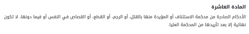 المادة العاشرة من نظام الاجراءات الجزائية أو المادة ۱۰ من نظام الاجراءات الجزائية السعودي ونصه : الأحكام الصادرة من محكمة الاستئناف أو المؤيدة منها بالقتل، أو الرجم، أو القطع، أو القصاص في النفس أو فيما دونها، لا تكون نهائية إلا بعد تأييدها من المحكمة العليا.